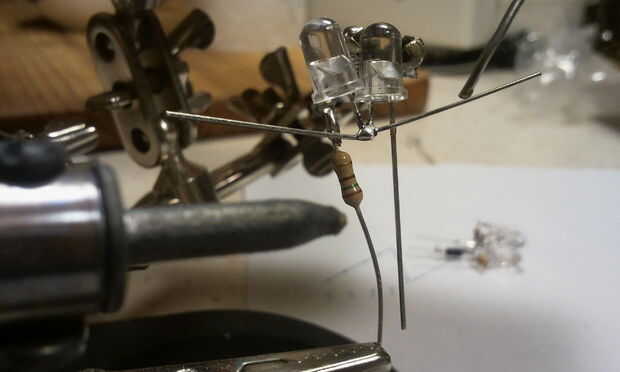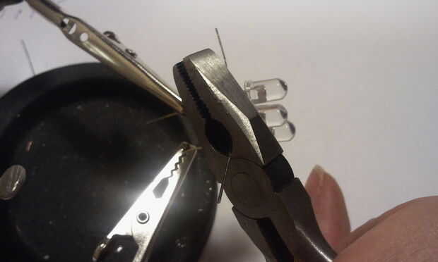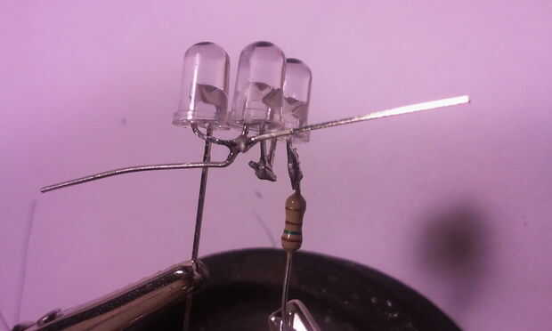 Ahora tenemos que doblar la catódica de la nueva led y el ánodo de un solo soldado y soldarlos juntos... y quitar el exceso metal (no cortar el ánodo del led!!!!!!) hacerlo con los tres... y segun ellos en un squre...