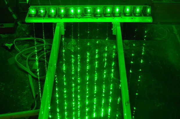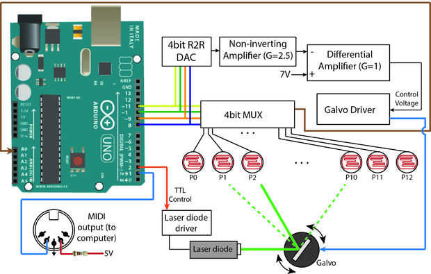 Esta arpa láser tiene trece cuerdas. Para generar estas cadenas, un rayo láser se mueve a posición trece diferentes (para trece cuerdas/notas diferentes) moviendo un galvanómetro de espejo. El galvanómetro del espejo, o galvo para abreviar, es un espejo que puede mover rápidamente en posiciones diferentes dependiendo de un voltaje de control que se envía a ella. Al final de cada láser beam es un fotorresistor que se utiliza para detectar si un haz de luz es bloqueado (con la etiqueta P0 - P12 en el esquema y se muestran como puntos negros en el gráfico). Cuando esto se detecta, se reproduce una nota. También necesitaba el rayo láser ser dado vuelta apagado al mover posiciones de modo que parecía como si hubiese trece posiciones distintas y no una hoja continua de luz.