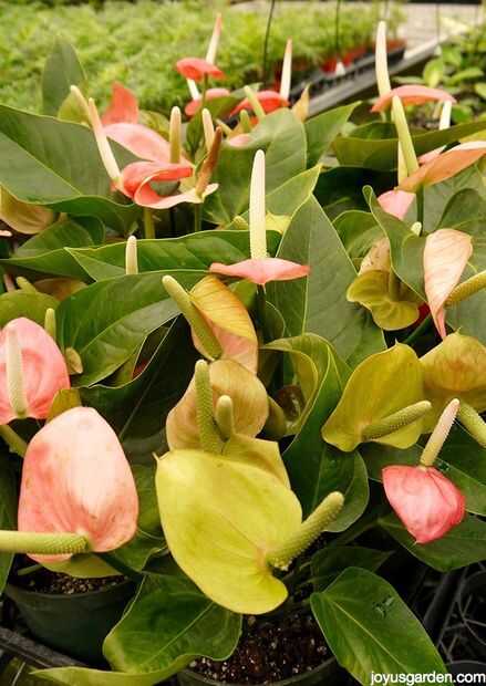 Anturios, con sus hojas de color verde brillantes y flores de brillo, realmente le dan una sensación tropical. Hay una variedad de color roja oscuro muy catching del ojo.