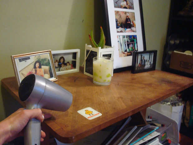 El pelo caliente de un secador de pelo afloje una etiqueta de precio o etiqueta haciendo retiro súper fácil. También puede utilizar este truco para quitar el papel de contacto de estanterias.