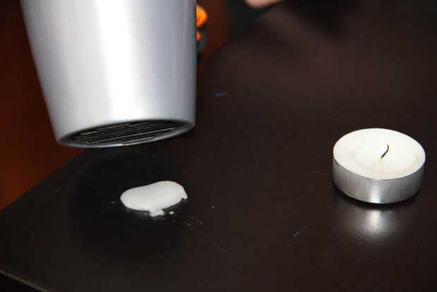 Conseguir cera de vela sobre muebles de madera puede ser una pesadilla para bajar (de nuevo con el rascado!!!).  La mejor forma de quitarlo es calor hacia arriba.  Fuego medio golpe en la cera hasta que empiece a derretir luego limpie con un paño.