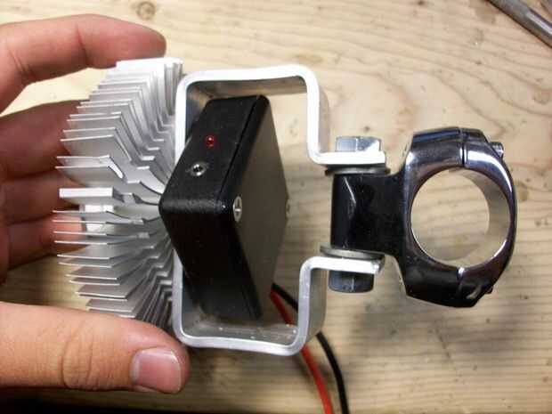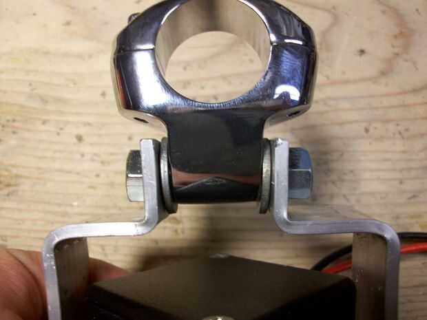 Para montar el ensamblaje de la luz en su bicicleta, claro primero un pequeño lugar en el manubrio de la abrazadera universal. Luego atornille y apriete la abrazadera hasta que queden muy apretados. Una vuelta o dos de cinta aislante en el manillar pueden aumentar la fricción un poco más si es un problema. Introduzca el perno de 1/4" a través de la parte superior del soporte, una arandela, el soporte universal, otra arandela y la parte inferior del soporte. Apriete la tuerca hasta que la luz se convierte en difícil de girar. Una tuerca de fijación se puede utilizar si usted no piensa en tomar la luz de encendido y apagado. Más tarde hice un soporte portátil para la luz, así que me quedé con una tuerca estándar.