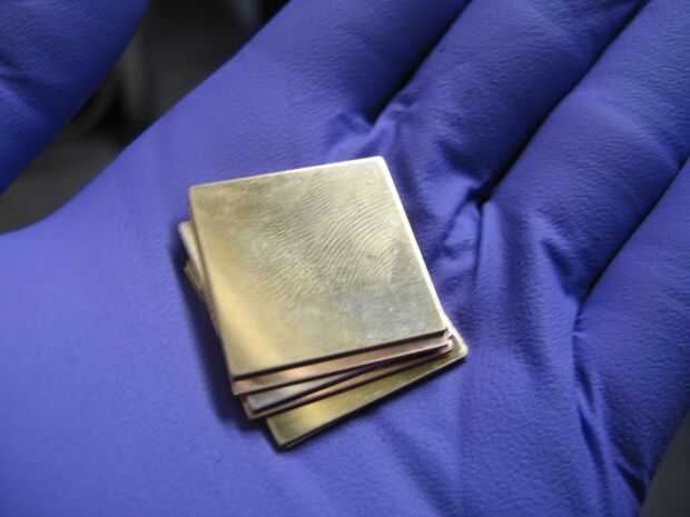 Vierta aproximadamente 100mL de acetona en su recipiente de cristal o pyrex. Uno por uno, poner las hojas de metal en él y frote suavemente ambas superficies (uno a la vez) con el dedo enguantado. Continuar hasta retiran todas las huellas. No tarda más de 30 segundos.