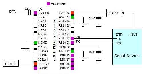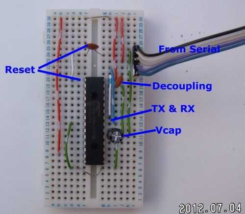 Aquí está el esquema completo. Tenga en cuenta que hay dos conexiones que van a los 3, 3V y tres conexiones a tierra de la fuente. El Vcap que se muestra aquí a 10uF es esencial, el extremo positivo va al pin 20. También funcionará un 4.7uF pero 10uF es recomendado por los fabricantes. El 0.1uF condensador conectado entre 3,3 v y tierra está ahí para reducir ruido. Como regla general 0.1uF condensadores se asperjan ronda circuitos electrónicos como son cientos de miles en un pastel.