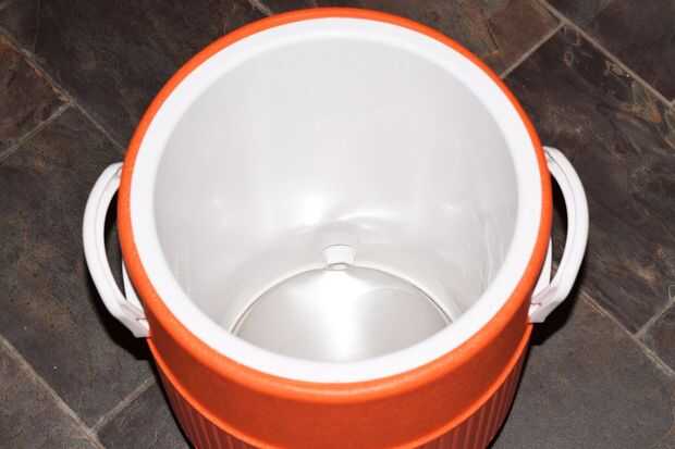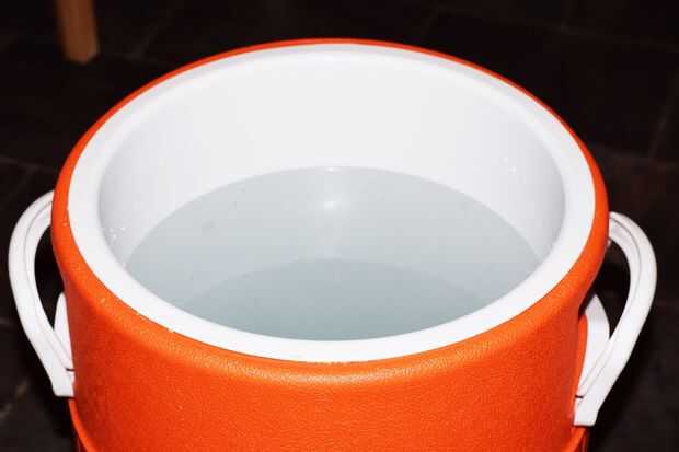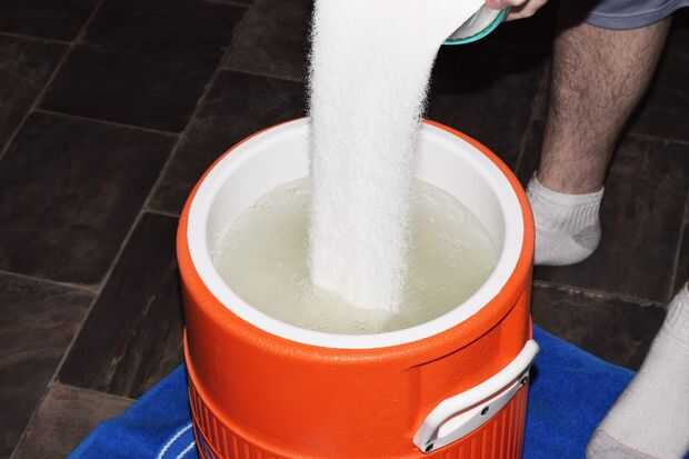 Coloque la bandeja de la torta en la parte inferior de la nevera. Dejando unos 3 a 4 pulgadas en la parte superior, llenar con agua (el hielo seco hará que se derrama por el borde un poco). Vierta 5 libras de azúcar y la botella de extracto de cerveza de raíz. Revuelva la mezcla.