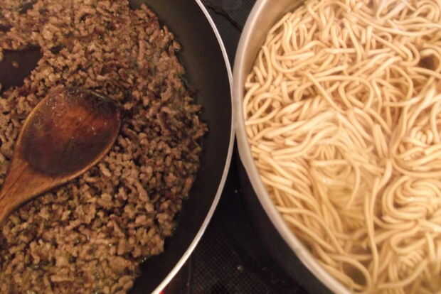 • encender la sartén y cuando caliente cuidadosamente añadir aceite y freir carne de res (u otro ingrediente de elección) de aproximadamente 10 minutos a fuego alto.  Asegúrese de que la carne es caliente y se cocinen completamente.