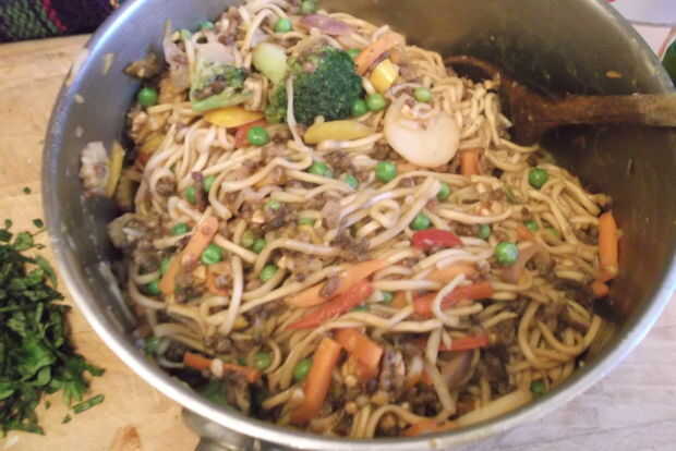 • Añadir los fideos a la cazuela con el salteado y la carne y verter sobre la mezcla de salsa