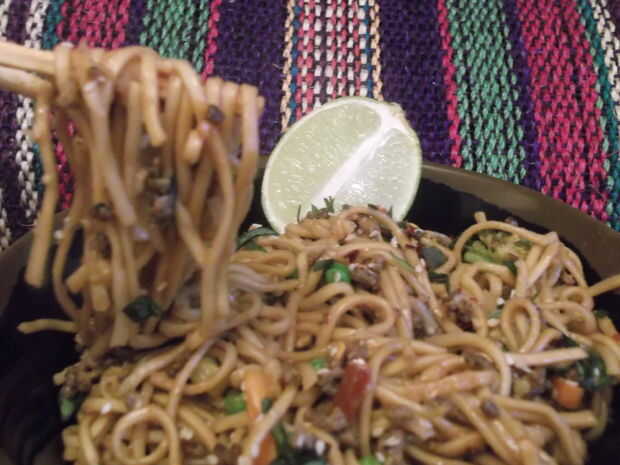 15 minutos la mantequilla de maní y carne de Chile (o carne de cerdo, gambas, tofu, pollo...) fideos! (7 / 7 paso)