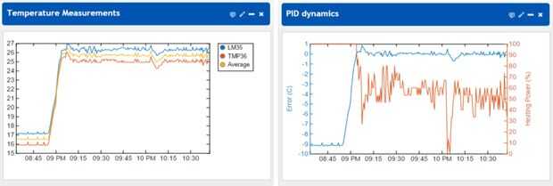 La figura derecha muestra un ejemplo de una secuencia de calentamiento de 9° C, donde la energía de la calefacción (línea naranja) es 100% para unos 9 minutos, a continuación, error de la temperatura, que es el desplazamiento desde el punto de ajuste bien estabiliza (línea azul) en la gama del ° C ±0. 3 alrededor del punto. La principal causa de inestabilidad es el cactus A2D, que puede leer los sensores de temperatura con un (3.3 V / 10 mV / ° C) / 1024 = 0,3 ° C de resolución, que está bien para el uso casero.