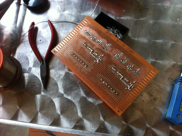Tome nota: cada '+' o en la rejilla de la distribución en el paso 3 que representa un agujero. El diseño consta de 52 '+' y 32 '+' de ancho. Mientras que el prototipo pcb consiste en 50 orificios de longitud y 30 de ancho.