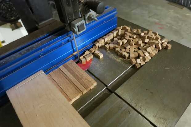 Después de conseguir suficiente tiras, hacia la sierra y utilice un tope de sacrificio a corte cubos de 3/8". Hacer más que suficiente y prepárate para el verdadero trabajo.