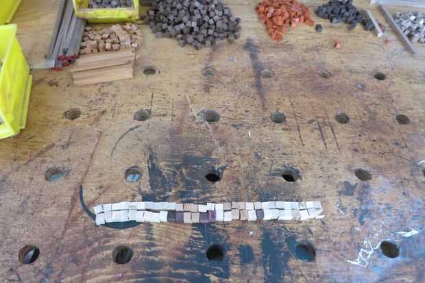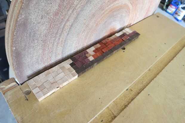 Voy a hacer la suposición de que no está usando un cortador del laser de los píxeles. Como yo, estás usando una pequeña Hanon que no es muy exacta. Si este es el caso, es probable tener sesgos desarrollar a lo largo de la Junta. Si esto sucede, no se preocupe. Cada pocas hileras, deje que el pegamento curar, tire de la composición de la tabla y utilice una lijadora estacionaria para enderezar la fila superior (ver mis otros ' ible en la fabricación de una lijadora de disco en su torno).