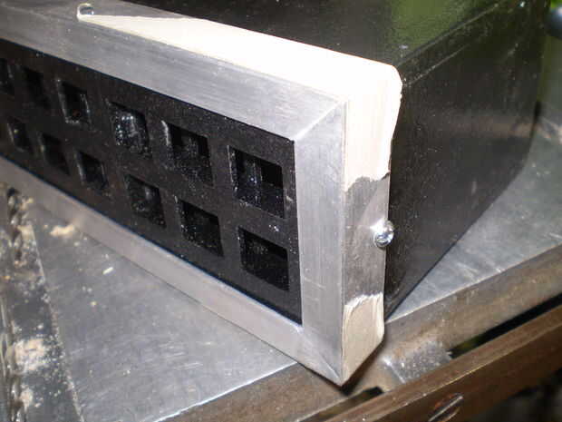 Ahora para terminar la cara. Poner una tira de Grab-It (o el adhesivo de su elección) y presione la placa frontal en la fama para hacer contacto con el adhesivo. Limpie cualquier apretón de la cara y seguro todo a la caja con los tornillos.
