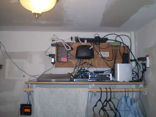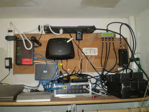 Bien hace ya casi un año construí mi panel de remiendo y mi centro de comunicación ha evolucionado bastante.  Ahora tengo dos conexiones a internet, una conexión DSL y una conexión de microondas de alta velocidad.  También he añadido HDTV de Direct TV, un teléfono de la línea de tierra y todavía tengo un par más alambres para agregar.  Todavía tengo que llevar un cable de HDMI de la cocina y sala de estar, un par más cables de red y una línea telefónica.  Con todo creo que está viniendo juntos bastante bien.  Realmente necesito trabajar en la gestión de cable aunque!  La segunda foto tiene todos los componentes marcados.