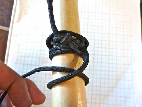 Atar el enganche rodante tan cerca del nudo de la jarra como sea posible, de tal manera que la pieza de carga entre dos nudos es paralela al poste (es decir viene directamente del enganche rodante y en el nudo de la jarra).