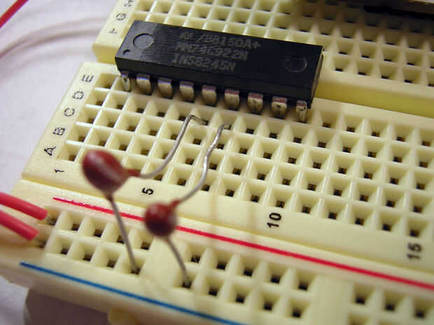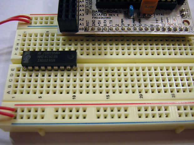Poner en el 74C922 en su protoboard, en algún lugar cerca pero donde no estamos encogidos. Si no estás familiarizado con IC, tome un momento para preguntarse en su nuevo chip brillante y notar que las piernas están ubicadas a cuando salen de la fábrica. Puede ayudar a entrar en la placa si se colocan de costado con sus piernas sobre la mesa y con un suave movimiento del balanceo un poco doblarlas hacia adentro. Al poner la nota de IC que hay una raya o hierba a un lado. Indica donde está el pin uno.
