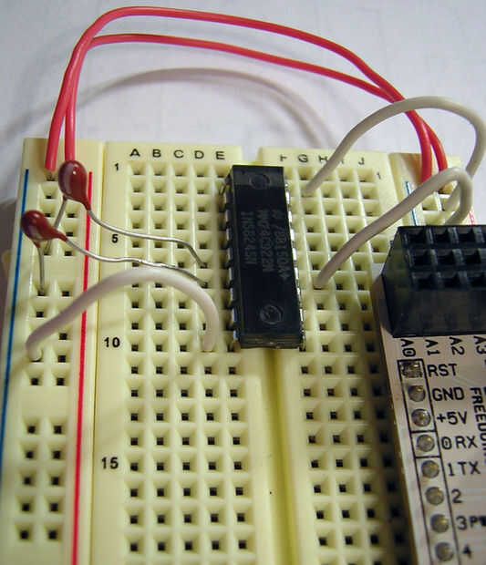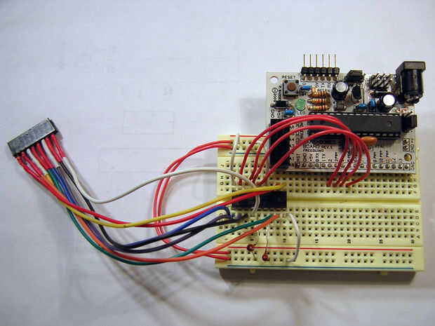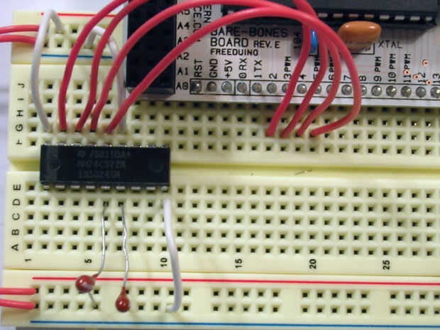 Ahora Conecte sus salidas de datos para el AVR. En la imagen siguiente he conectado los datos hacia fuera (DO) A PD2, DOB para PD3, DOC a PD4 y DOD de PD5. Ahora sería un buen momento para conectar la clavija de datos disponibles (la una derecha a continuación de la OE funcionó a tierra a la derecha) en el microcontrolador. Elegí PD6. Bonito bloque contiguo de i/os. Si nosotros podríamos pensar que son los mismos dos números no consecutivamente podríamos dejar fuera de los datos disponibles y a sondear los datos hacia fuera los pernos. Reduciría nuestras necesaria previamente ocho líneas de E/S a solamente cuatro! Para completar, estoy incluyendo porque eso es el pin que te de servicio con una interrupción de cambio de pin. Es mejor que la votación y deja su computadora hacer otras cosas en lugar de esperar en lazos el estado del pin de la interrogación.