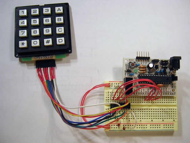 Finalmente, conecte los cables de entrada. La parte superior izquierda cuatro pernos ir a filas uno, dos, tres y cuatro. Los dos pernos entre el condensador y el suelo en la parte inferior izquierda conectan columna cuatro y tres. En el otro lado, la lectura de la parte inferior derecha, las clavijas para conectan columna dos y uno. Mente el orden! Conecte el teclado si había hecha un cable para ella y fuego su microcontrolador!