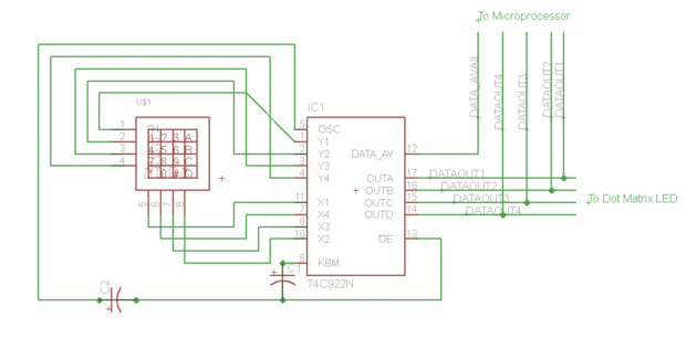 El pinout de la 74C922N se muestra en un esquema que he incluido a continuación que muestra sólo este IC. También he incluido un esquema de águila, aunque el dispositivo de teclado filas y columnas hacen el circuito difícil de interpretar, por lo que también incluyo mi mano escrito el esquema que hice cuando empecé a jugar con el teclado y el 74C922. Ojala uno de esos se resuelve cualquier problema de conectividad, si usted tiene alguno.
