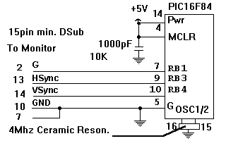 El circuito es muy simple. Consiste en el microcontrolador PIC 16F84A y el conector VGA hembra de 15 pines.