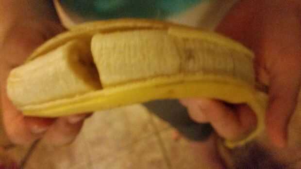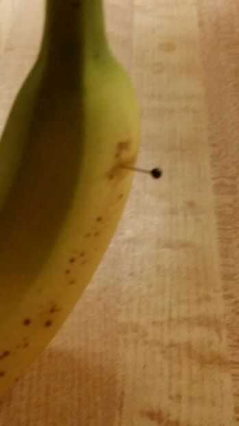 Meter una aguja en un plátano y especias a través de él en varios puntos. sólo derivando el interior. así que cuando alguien abre es cortado.