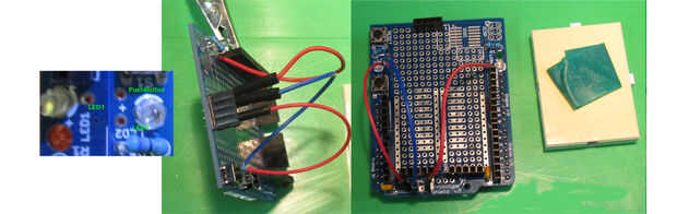 Para los cables de Dupont, localice los dos LED donde en cada LED será un agujero fabricado como se muestra. Además en la ubicación marcada LED2 es otro agujero fabricado que está asociado con el pulsador. Simplemente soldar el extremo pelado de la cortada Dupont M-M a través de los agujeros. El esquema de color no tiene ninguna incidencia en la funcionalidad pero aquí rojo fue utilizado para los LEDs y el azul para el interruptor. Algunas veces es útil para una cosa sencilla con un poco de uniformidad.