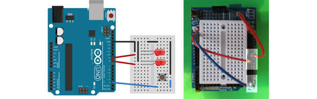 El diagrama muestra un cableado equivalente de los LEDs y el pulsador de la pantalla de creación de prototipos. La conexión de GND a la parte de Arduino de la configuración de pines de la pantalla, para trabajar con el siguiente código las clavijas macho de Dupont debe conectarse como: