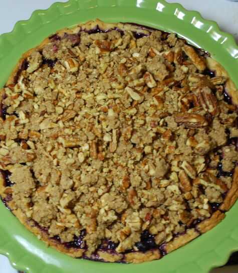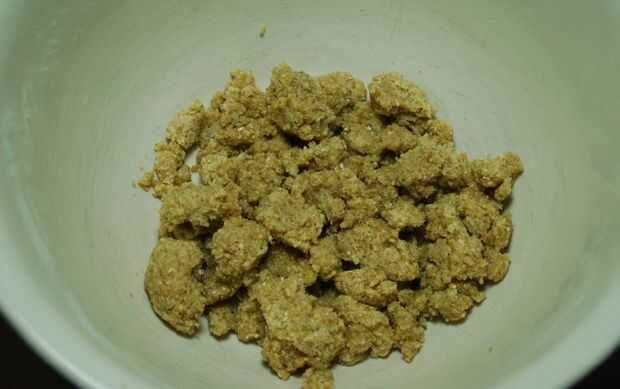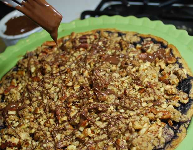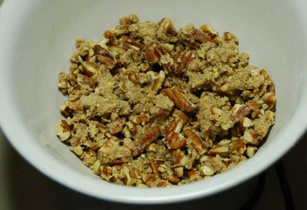 Mezclar el resto de la harina con la mantequilla, azúcar y nuez moscada. Mezclar las nueces.