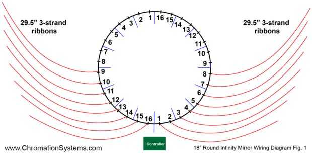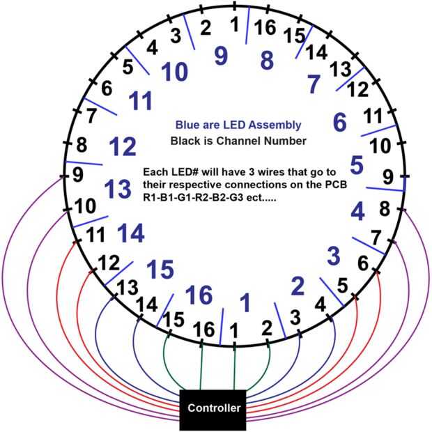 - A partir de las 16 LED al otro lado del regulador, alambre llevado 16-9 con una cinta de 3-strand de 29,5" hacia el siguiente LED del mismo número. Consulte el diagrama