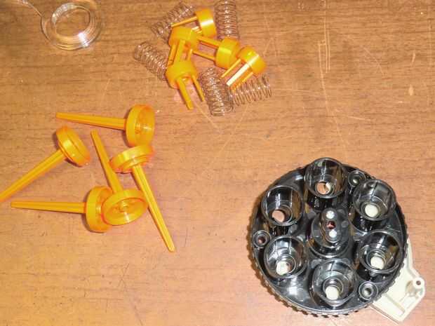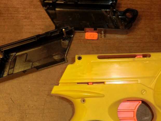 Cuidadosamente separe los dos pedazos de plástico amarillo grandes. Sacar el tubo y cuidadosamente con un martillo de uña saque la varilla de metal. Tenga cuidado, no perder el resorte. Retire los tres tornillos en la parte posterior (parte negra) del tubo y deslice suavemente la parte superior de la barra de.