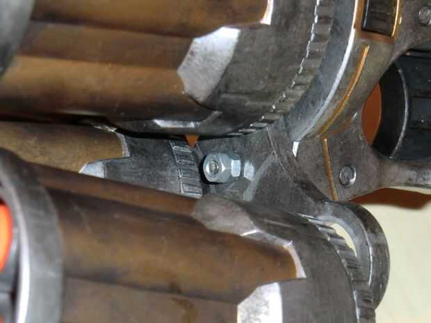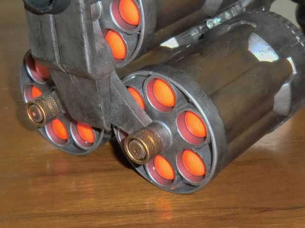 Una vez que haya terminado, usted tendrá que volver a montar el cañón. En lugar de utilizar la pieza frontal gris pequeño, utilice la pieza de conector frontal, como se muestra en la tercera foto. No olvidar el resorte y un martillo la varilla hacia el cañón. Una vez terminado un barril, gire el mecanismo y adjuntar otro.