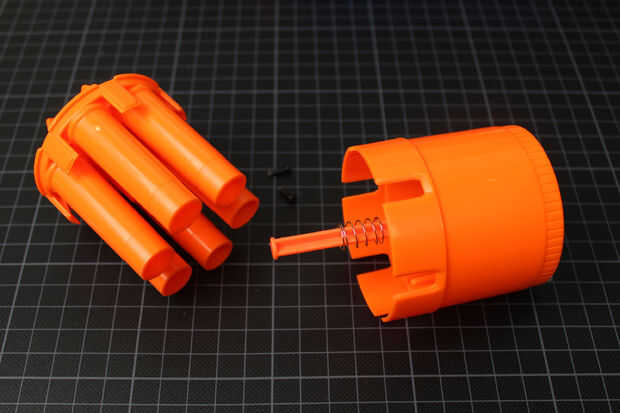 Comenzar sacando todos los tornillos de la carcasa exterior. Luego quite el cañón. La parte gris en la parte delantera es floja y sólo puede ser halada. La parte posterior se atornilla en su lugar, para conseguir de usted primero tendrá que sacar las dos cáscaras de naranja aparte. Empezar por quitar los dos tornillos que se mantiene juntos. Usted tendrá que moverse la pieza gris para llegar a ellos. Separándolas de las piezas pueden tomar algún esfuerzo, ya que son equipada de presión.