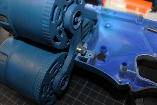 Coloque el conector que va en la espalda encima de los barriles, como se muestra en la imagen y añadir algún lubricante para reducir la fricción. Luego vuelva a montar los cañones. Atornille el conector que va al frente en su lugar, como se muestra en la cuarta foto y añadir algún lubricante a los cilindros.