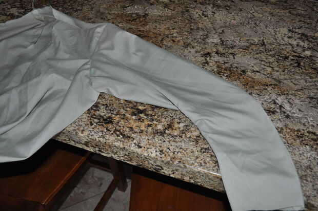 Corte una maqueta de la manga y tratar de sujetarlo. Sólo necesitas una manga para la maqueta. Tenga en cuenta que este proceso puede requerir unas pocas iteraciones. Me tomó al menos tres intentos para hacer el manga mira a la derecha. Entonces me tomó varios intentos más para obtener el manguito colocado sobre la capa de forma que me ha gustado. Prueba en comparación con una capa de juego que ya sabe que le cabe muy bien.