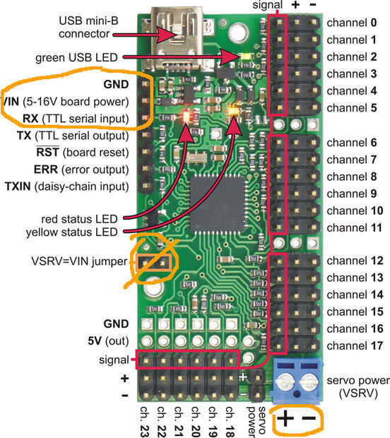 2. lo que usted necesita en la zona del chip: serie pasando al pin RX en chip, de potencia VSRV y VIN, de tierra GND, y un montón de servos