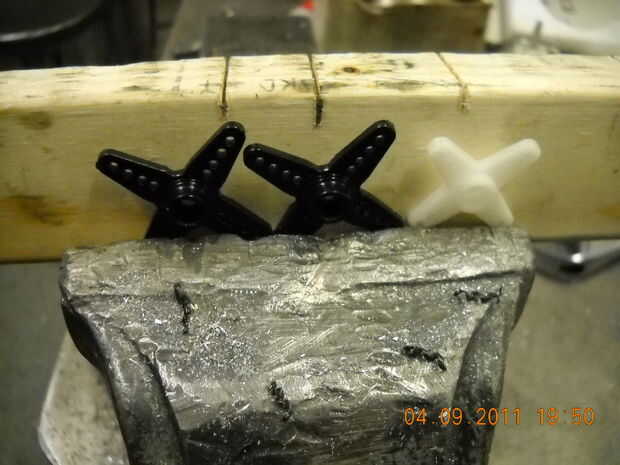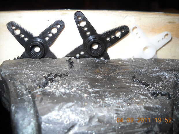 Para evitar demasiado rebabas en la parte posterior y dar el vicio algo gruesa para amarrar, pongo un bloque de madera detrás de los cuernos de servo. Estos agujeros se pueden hacer formas libres con sólo un taladro de mano porque el plástico es tan suave, especialmente con un taladro de centro para los segmentos del fémur/tibia, pero usted simplemente no obtener cortes bien (y tenga cuidado de no enviar cosas volando si no presiona con la mano lo suficiente). En realidad, realmente no puedo recomendar hacerlo sin abrazaderas o un tornillo de banco, por razones de seguridad.