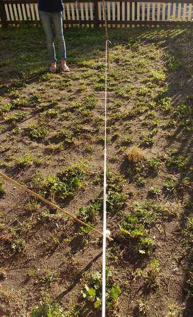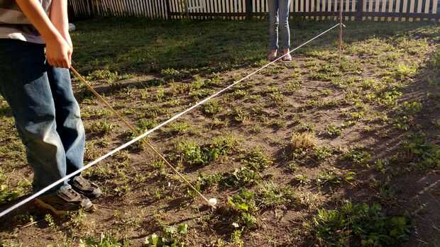 Paso uno: Atar cada extremo de una cuerda o cadena a la parte superior de dos apuestas diferentes. Colocar una estaca en el suelo detrás del centro del agujero. Coloque otra estaca en el suelo detrás de ti, para que la cadena está por encima de donde está la bola.