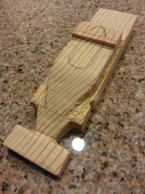 Hacia el perfil superior, cortando las dos grandes brechas entre el ala delantera y ejes de rueda. Después de eso, usé la dremel para hacer algunos cortes muy ásperos para empezar a trabajar en la caja del cuerpo de coche.