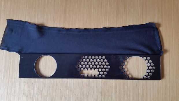 Encaje los bits de finales de la caja izquierda el proyecto hecho más o menos, el último trabajo fue crear la cubierta del altavoz de la tela, que era sólo una versión del uno para el sonido, con el corte de agujeros adicionales. La tela del altavoz fue superglued al marco y apareció en su lugar, con la tela superpuesta escondida detrás de los nuevos paneles a los lados.