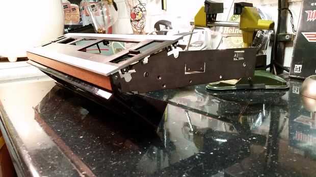 Perforar orificios en la parte delantera de la tapa de caja de aluminio, luego atornillados en el recinto de la barra de sonido, conexión a parte inferior de la caja con los soportes de meccano, algo usé mucho en esta construcción. Esto levantó el conjunto unos 30 mm en el frente, usé tornillos de 10mm para techos igualmente toma y conecte la parte trasera del chasis sólidamente a la base. Esto funcionó muy bien como el perno jefes se fijaron firmemente a la base, lo que significa el chasis podría subir o bajar precisamente ajustando sus tuercas de fijación. Por ahora he tenido un caso sólido, pero vacíelo - tiempo para agregar en algunas cosas!