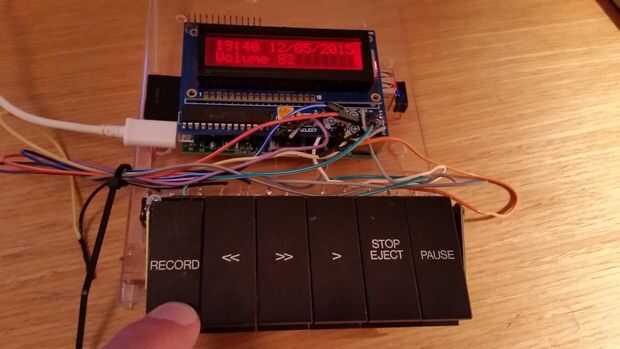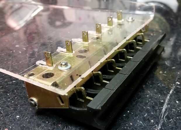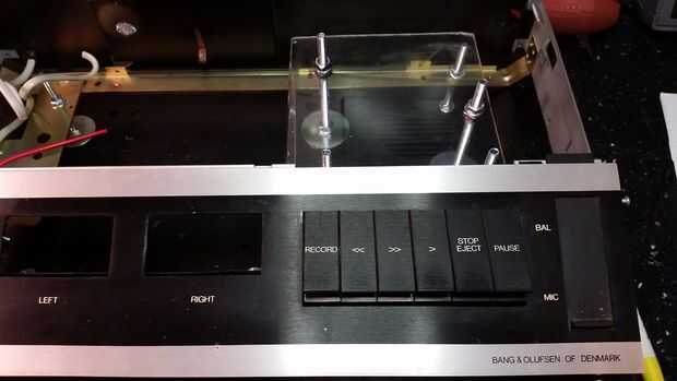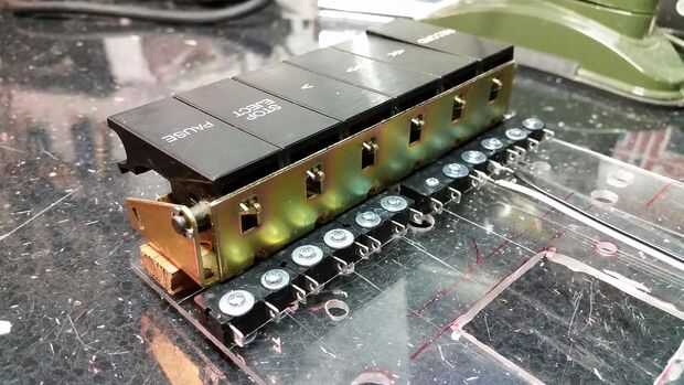 Trabajaron originalmente un sistema complejo de palancas para controlar las funciones de la cinta, y fue genial que desmantelaron en el chasis de la cinta como un subconjunto de autónomos, con sus muelles y palancas intactas. Yo les atornillados a la plataforma de plástico, corte un agujero debajo de cada interruptor de la palanca empujar a través. Un par de mm de cualquier manera haría los interruptores en el caso del palillo para que esto tomó un tiempo. Yo quería estos botones para controlar la radio, así que había atornillado un microinterruptor palanca pequeña detrás de cada uno de ellos, para que la "cola" del botón que originalmente trabajó un mecanismo ahora haga clic en el interruptor. Fue en este punto que tenía que salir y comprar una tuerca nueva y un surtido de pernos, como que ya había agotado mis provisiones!