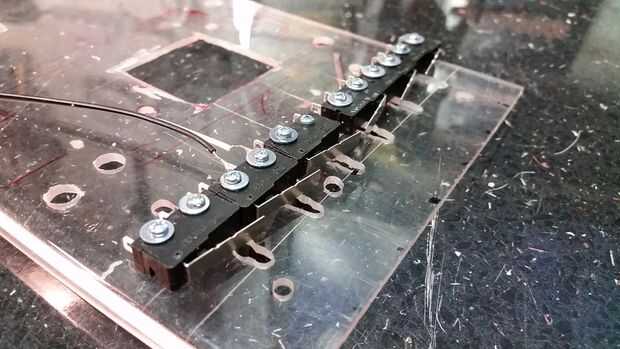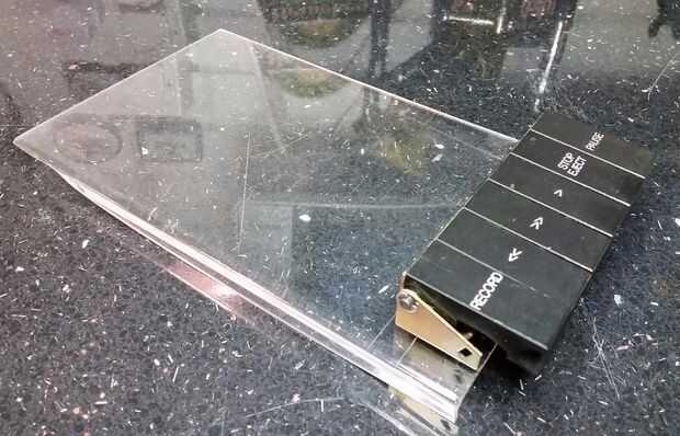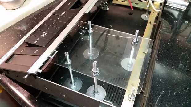 Los pernos de la cubierta funcionados tan bien en el caso de que eran una opción obvia para apoyar esta plataforma flotante. Excavando alrededor de materiales encontré un viejo marco de fotos metacrilato gruesa, ideal para el trabajo. No sólo era más fácil de cortar y trabajar con que el metal, también fue transparente, muy práctico para marcar con precisión a los agujeros de montaje. Primero perforé los orificios para los tornillos del material para techos, entonces con la plataforma de asegurado en su lugar medido (varias veces) que el conjunto del interruptor tendría que montarse. Quería hacer mejor uso de los botones de control de cinta mecánica grande, ya que hay algo realmente sólido y táctiles, como teclas de piano casi.