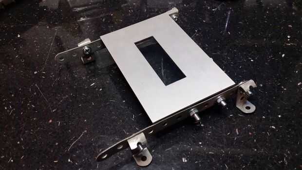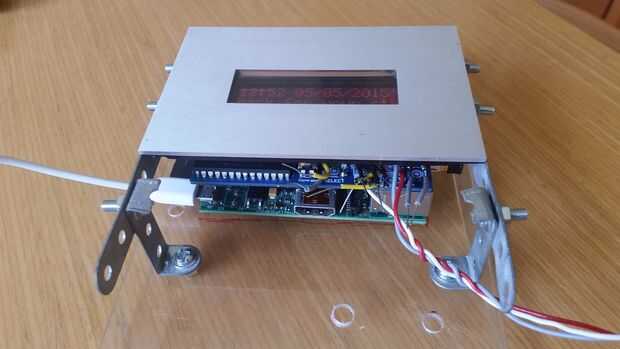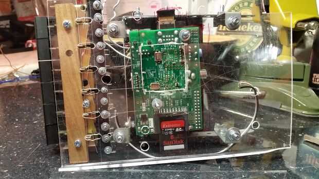 Con los botones y los microinterruptores para la plataforma lo siguiente a montar fue el Pi sí mismo y la tapa de la cinta con la ventana. La tapa tenía varios agujeros de montaje práctico a los lados – incluso más convenientes ya que fueron separados la misma distancia aparte como agujeros meccano! Originalmente había esperado hacer la tapa de la cinta pop-up, revelando la Pi, pero esto era demasiado complicado, así que hice meccano abrazaderas para sujetar firmemente a la plataforma de plexiglás. Ahora que la tapa de la cinta estaba en exactamente el lugar que tenía que hacer lo mismo para el Pi y esto es donde realmente ayudó la plataforma de plexiglás, como pude posicionar el Pi vivió debajo de la tapa y luego marcar con precisión el Pi es agujeros de montaje mirando a través del plexiglás del otro lado.