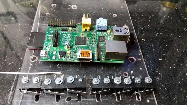 Con el Pi firmemente en su lugar alambré los interruptores de palanca botón frontal hasta los postes del puente en el circuito de exhibición.