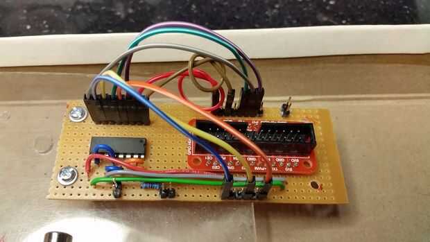 Decidí volver a esto más adelante y transferir el circuito de protoboard sin soldadura a una placa perforada soldada, utilizando más del cableado original de las conexiones permanentes y había soldado posts para las conexiones de GPIO, por lo que se podría cambiar si es necesario.