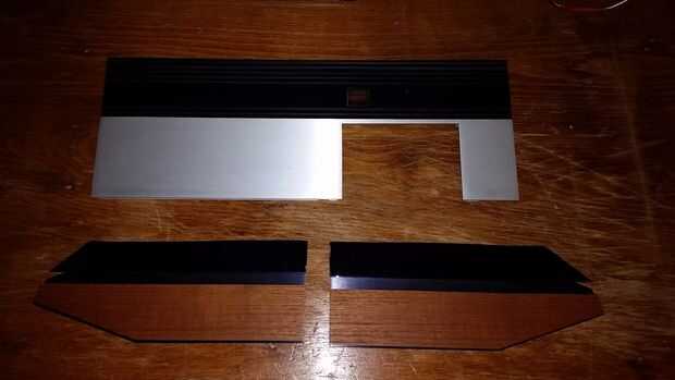 Inicialmente quería usar aluminio hoja para tapar los huecos pero solo no tengo las herramientas para cortar precisamente lo suficiente y apropiado al caso habría sido difícil con todos los componentes ya instalados. Los lados de aluminio efecto madera fueron cabidos para el cuerpo del caso con tornillos pequeños, ocultando todos los tornillos en el interior, así que decidí extender solo estas añadiendo una "falda" de plástico negro en la parte inferior de cada una, cortadas al tamaño correcto.