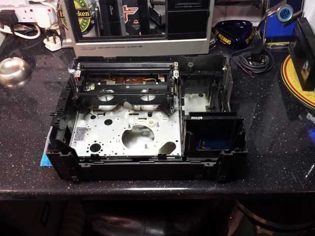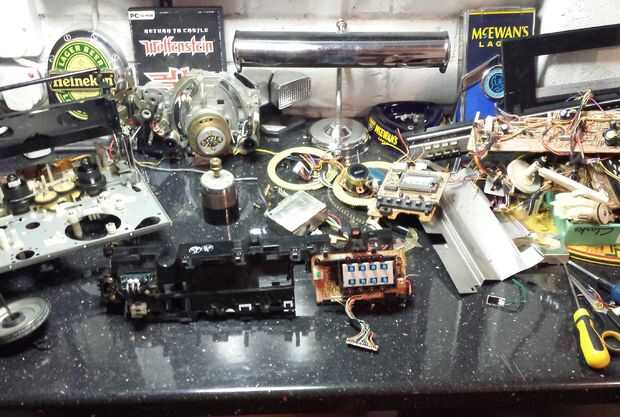 También había varios motores para trabajo pesado, solenoides, palancas etc y metros de cableado interno, que algunas de las cuales reutilizado. Los casos y llevó a cabo menos componentes y levantado fácilmente, dejando una estructura central de plástico que contiene un chasis de aluminio con el interruptor de circuitos en una fila en la parte superior. Con cuidado desconectar y despojado a todos los componentes excepción la jaula cinta y mecanismo de expulsión y se trasladó de la destrucción a la fase de rascarse la cabeza!