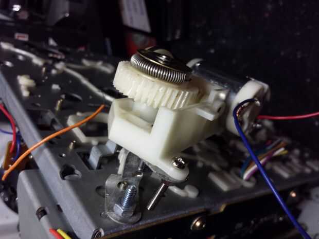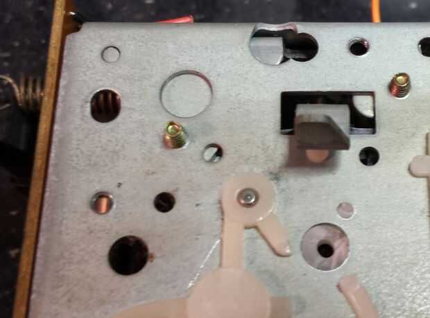 Uno de los primeros trabajos fue para asegurarse de que funcione el mecanismo de expulsión. Algunos de estos VCRs antiguos tienen un botón mecánico, que sólo libera un pestillo con resorte, pero creo que éste utiliza solenoides para convertir una pulsación suave en escupir hacia fuera la cinta. Que se pega a través del chasis era una pequeña traba, que de alguna manera debían mover unos 10mm para liberar la cinta. En primer lugar trató de volver a utilizar algunos de los solenoides originales pero manteniendo la tensión bastante baja estos simplemente no tenía suficiente gruñido para abrirla.