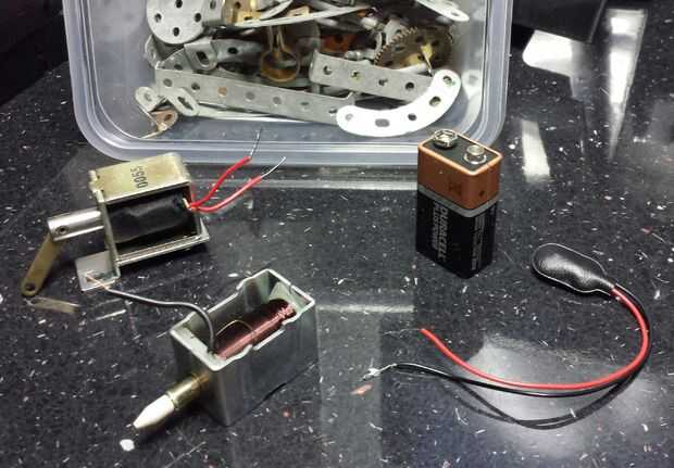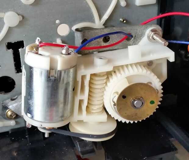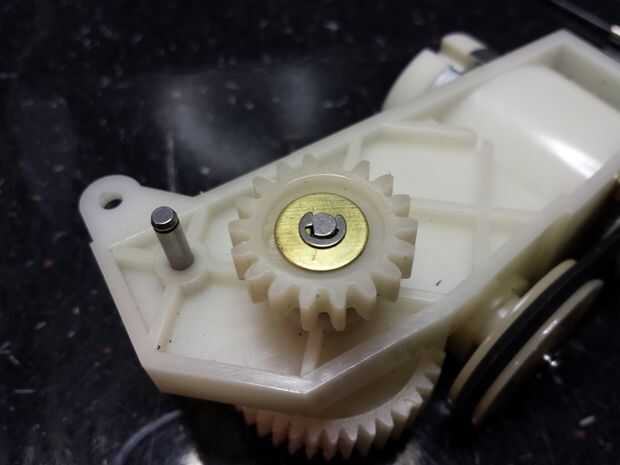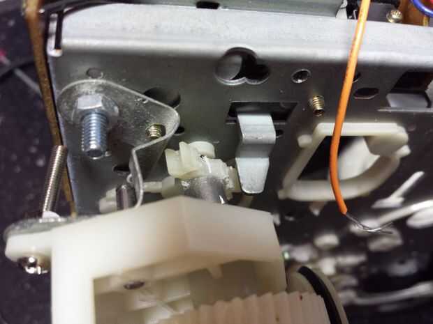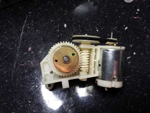 Mirando a través de mi caja de piezas descartadas encontré un pequeño mecanismo que consta de un motor, rueda de gusano y dientes y esto resultó para ser ideal. La rueda de gusano era el motor no podía ser empujado hacia atrás por la presión del pestillo, y funcionó bien de una pila de 9v. Para hacerla mover el pestillo que me la pelaron abajo de uno de los dientes, eliminando la mayoría de sus dientes a dejar la clase de un brazo giratorio que montaría junto al pestillo, disparo cuando el piñón gira.