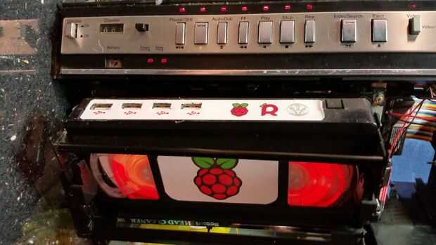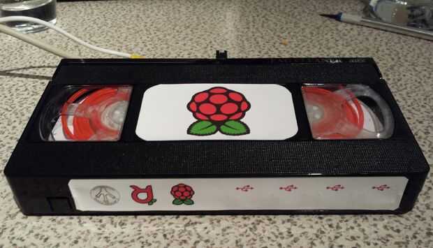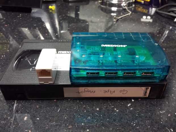 Mencioné anteriormente que manteniendo la característica de expulsión fue obligada con esta versión, así que comencé a pensar en lo que sería expulsado y cómo esto podría encajar en el diseño general. Algo construido en una vieja cinta VHS fue la respuesta obvia - debate con la ethernet o enchufe en la cinta o la cinta que contiene un disco duro portátil, pero colocado sobre la incorporación de un concentrador USB. Incluso con cuatro puertos USB el B + del modelo corría un poco corto, y quería ser capaz de conectar un disco duro autoalimentado de USB sin tener que preocuparse de la PI con suficiente poder para ejecutarlo.